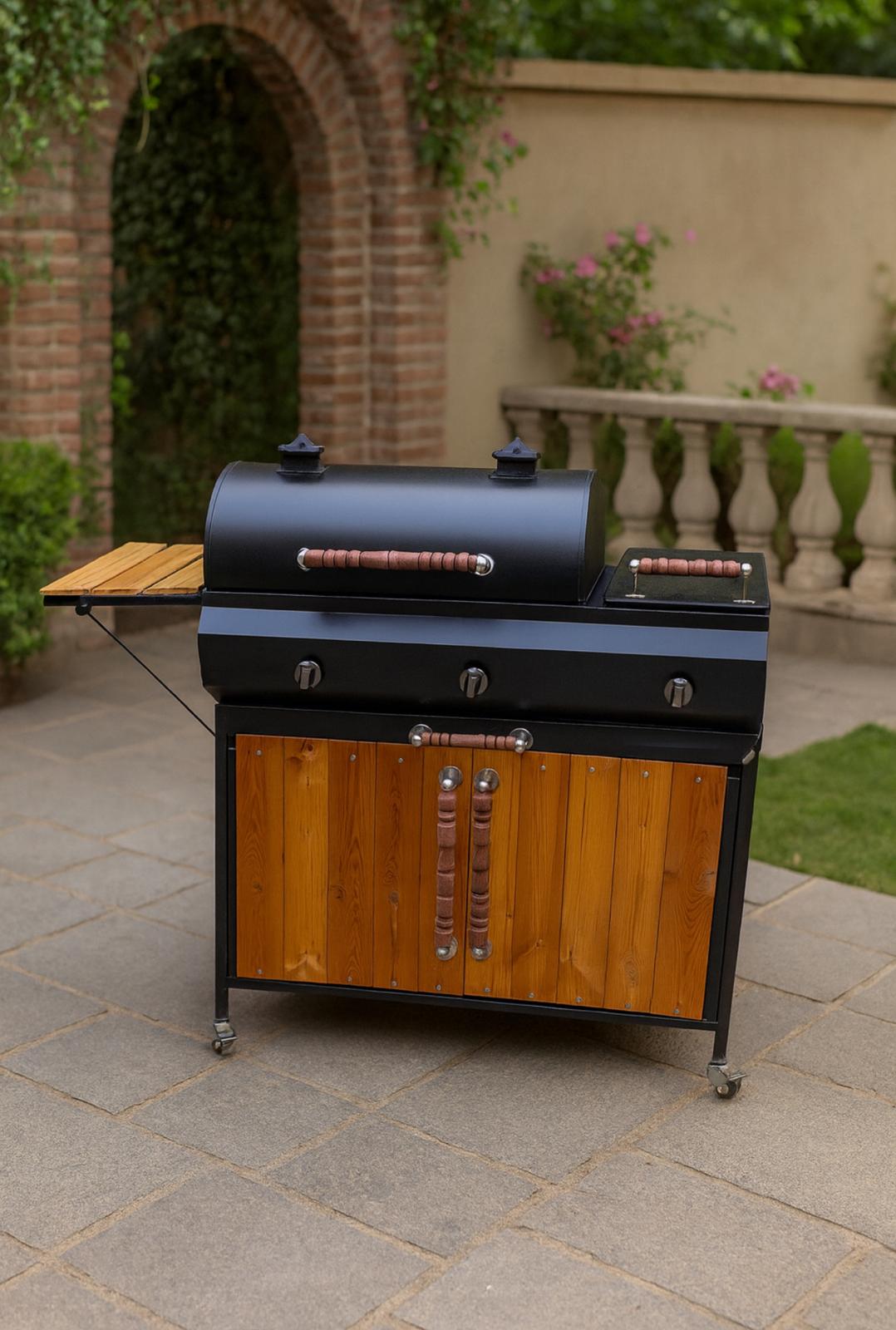 باربیکیو گازی و ذغالی با سایز دهنه ۱۰۰ سانت با خوراک پز و کابینت و میز کار ترمو در سمت چپ (مدل B100-L3)
