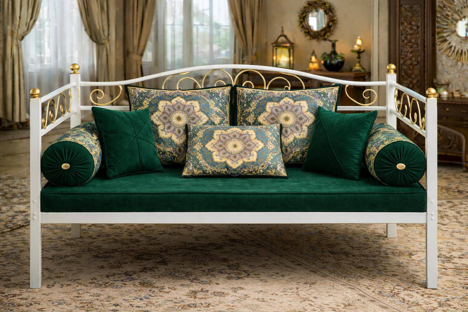 ست کامل شاه نشین سنتی لوکس با کوسنها و بالش های مخملی و طرح اصیل ایرانی رنگ سبز یشمی