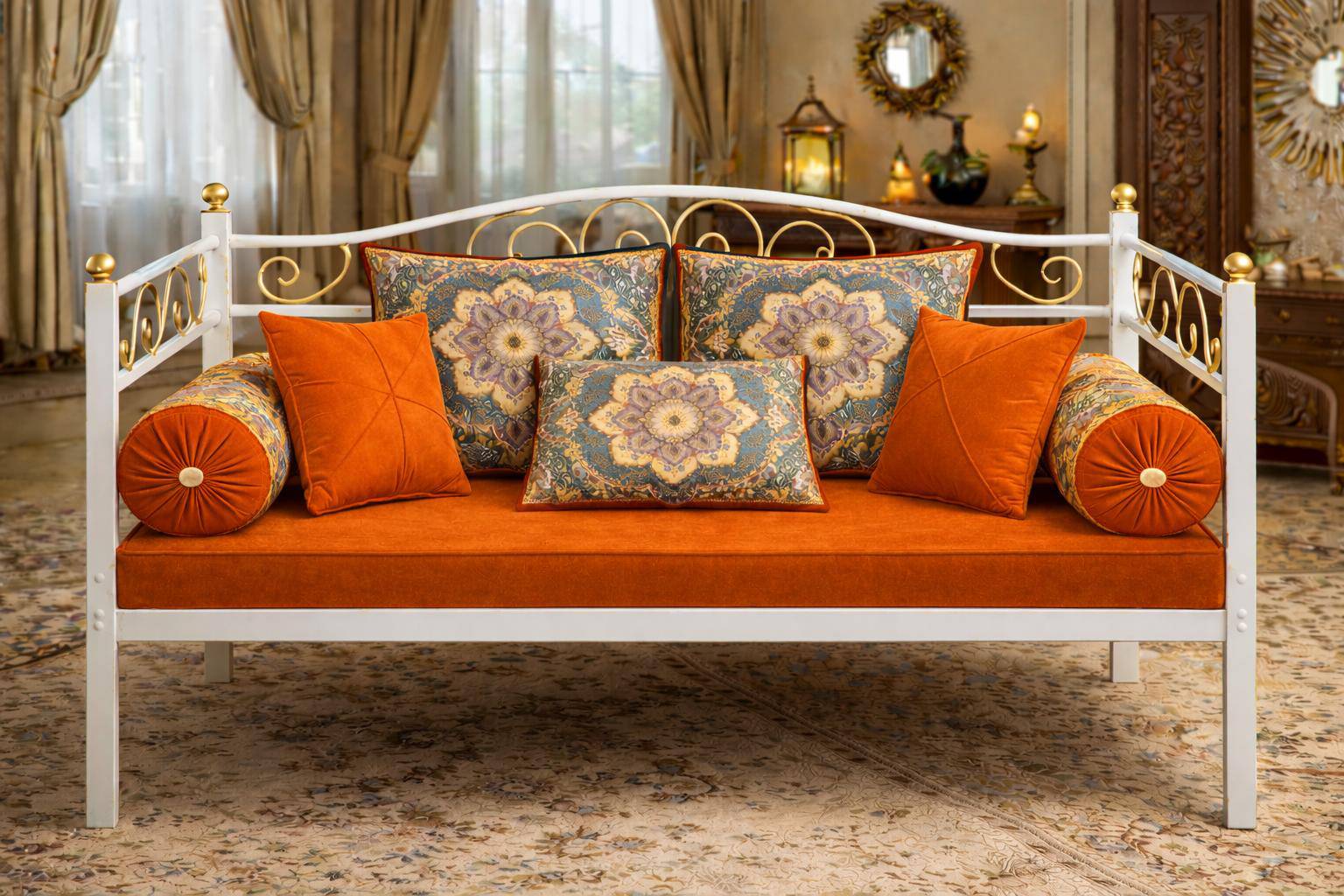 ست کامل شاه نشین سنتی لوکس با کوسنها و بالش های مخملی و طرح اصیل ایرانی رنگ نارنجی