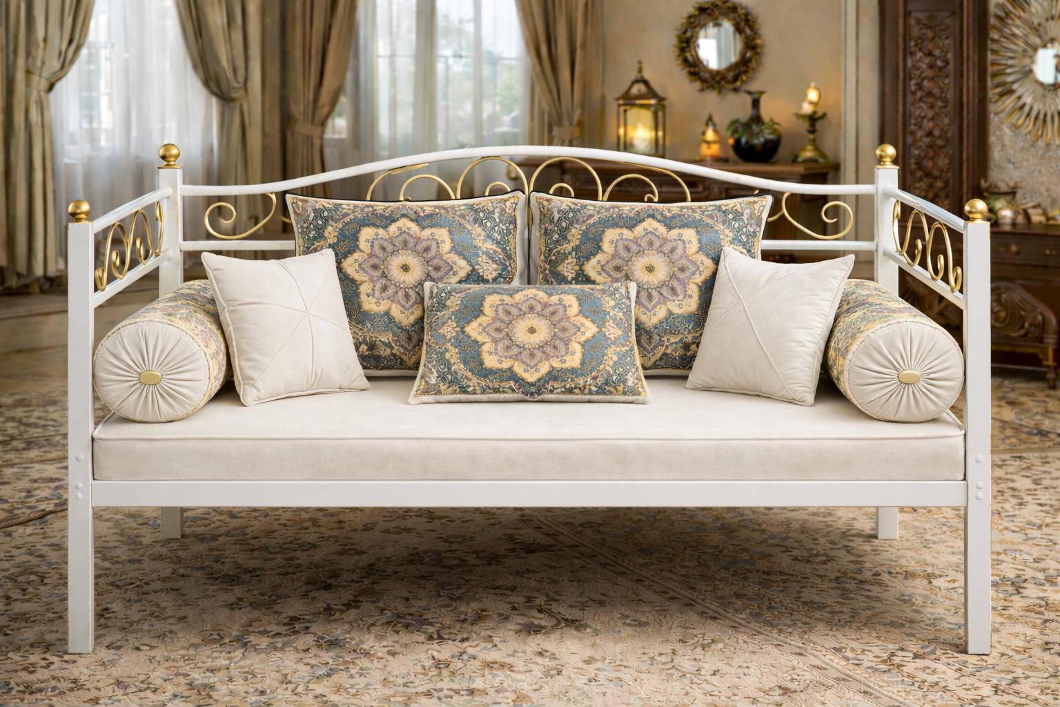 ست کامل شاه نشین سنتی لوکس با کوسنها و بالش های مخملی و طرح اصیل ایرانی رنگ سفید